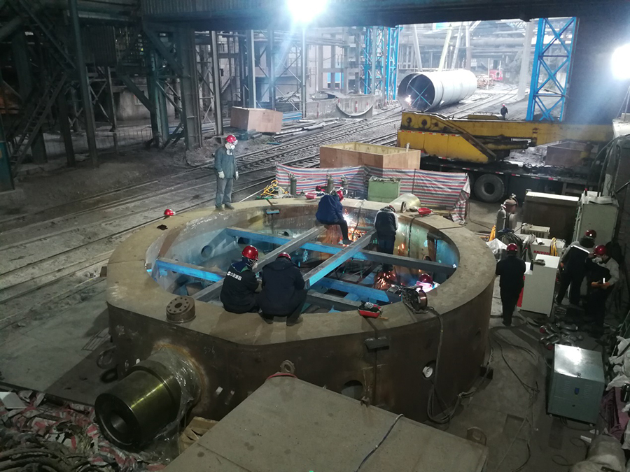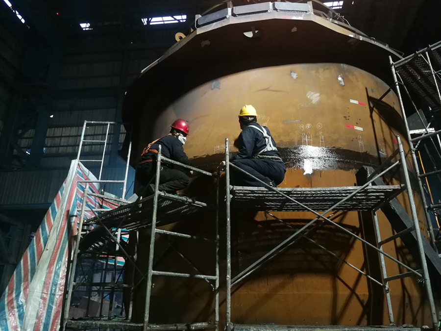 這是遼寧方大集團北方重工首次實施轉(zhuǎn)爐項目現(xiàn)場安裝作業(yè),為保證產(chǎn)品質(zhì)量,北方重工選派出企業(yè)內(nèi)最出色的焊接工人,由技術(shù)骨干印思陽帶隊,協(xié)同質(zhì)檢、生產(chǎn)、無損檢測等各專業(yè)人員前往現(xiàn)場實施安裝作業(yè)。安裝過程復(fù)雜,作業(yè)難度高,但北方重工現(xiàn)場服務(wù)人員憑借豐富的生產(chǎn)經(jīng)驗,通過增加工藝支撐、改變焊接方法、焊接位置、焊接順序,延長焊縫保溫時間等多種方式確保產(chǎn)品的整體尺寸要求和焊接質(zhì)量。質(zhì)檢人員嚴格把關(guān),對焊接的電流、電壓、預(yù)熱溫度等進行實時監(jiān)測,最終所有焊縫的無損檢測一次性通過,水壓試驗一次性達到用戶的使用要求。