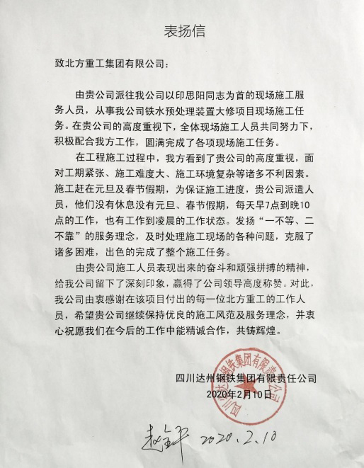 歷時34天,出色完成四川達鋼轉(zhuǎn)爐改造項目,順利通過用戶驗收,遼寧方大集團北方重工安裝人員以嚴謹?shù)墓ぷ鲬B(tài)度,飽滿的工作熱情,高超的技術(shù)水平得到了用戶的贊揚和肯定。