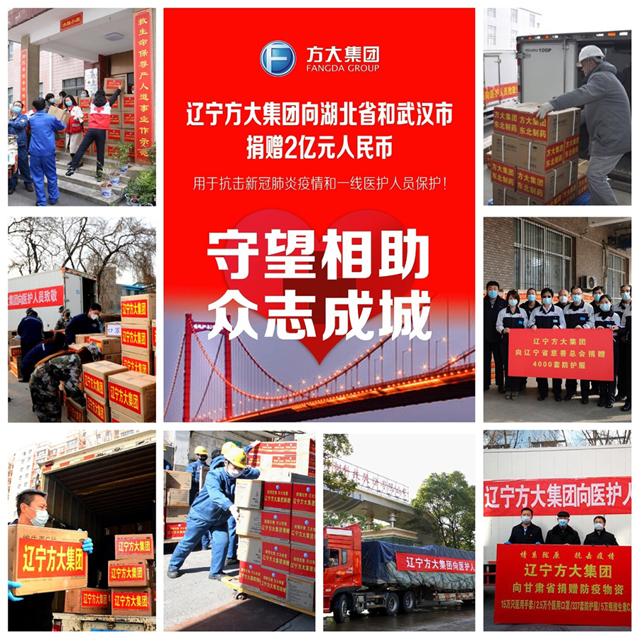 1月28日,遼寧方大集團向湖北省和武漢市捐贈2億元人民幣;2月2日、9日,方大群眾醫(yī)院重癥醫(yī)學(xué)科護士胡楠楠和曹寧,醫(yī)院醫(yī)生劉兆崇及護士李春、曹露、徐曉萌、萬佳彤兩批共7名醫(yī)護人員參加遼寧省馳援湖北醫(yī)療隊,走上抗疫第一線;2月10日,方大集團再次向湖北省和武漢市捐贈當(dāng)前急需的防護服2萬套;2月7日,方大集團向家鄉(xiāng)沈陽捐贈急需醫(yī)用防護服;2月14日,方大集團通過沈陽市紅十字會向沈陽醫(yī)護人員無償捐贈26.5萬只醫(yī)用外科手套;2月16日,方大集團從加拿大緊急采購的3500套防護服和14950雙防護靴在運抵沈陽后,第一時間捐贈給遼寧省紅十字會,同時捐贈的還有30000只醫(yī)用手套;2月17日,方大集團馳援江西10萬瓶維生素C片、5萬瓶乙醇消毒劑和50萬只醫(yī)用手套等防疫物資;2月19日,又通過甘肅省紅十字會和蘭州市政府捐贈了5萬個醫(yī)用口罩、30萬只防護手套、674套防護服和10萬瓶維生素C防疫物資;2月24日,方大集團再一次向家鄉(xiāng)沈陽捐贈23800套醫(yī)用防護服,這也是新冠肺炎疫情發(fā)生以來沈陽市接受捐贈數(shù)量最大、價值最高的一批防護服;2月25日,方大集團又從境外采購8000套防護服,通過遼寧省紅十字會和遼寧省慈善總會再一次捐贈給了家鄉(xiāng)遼寧。